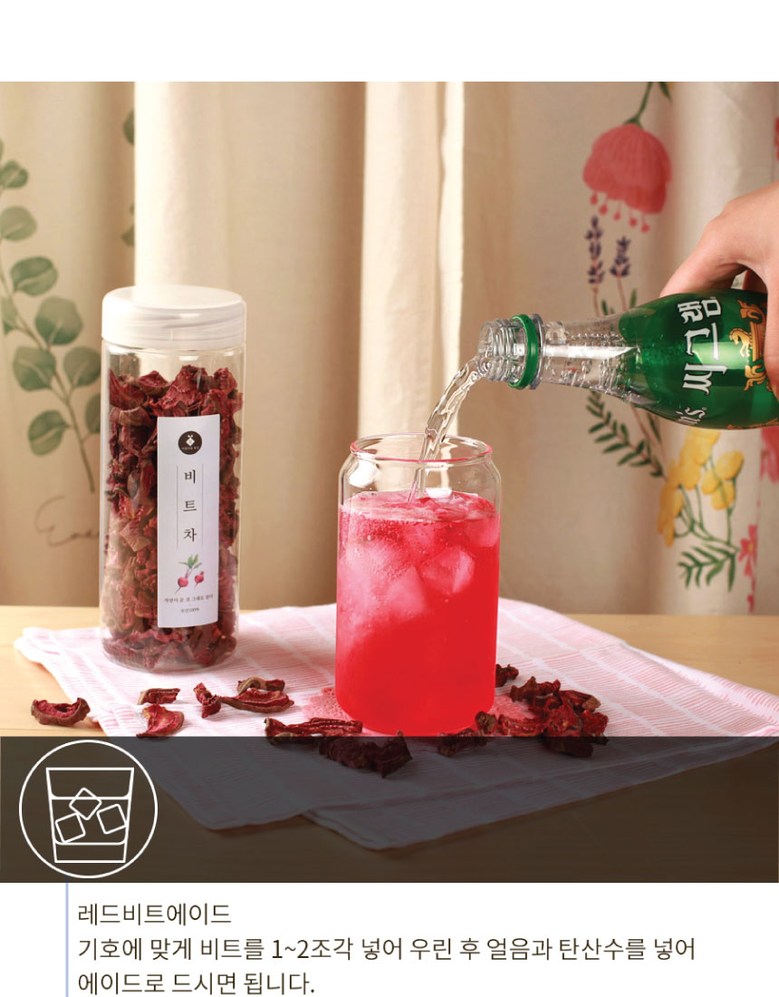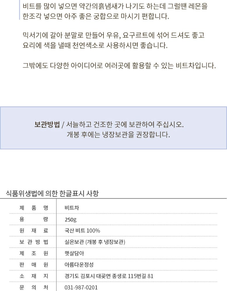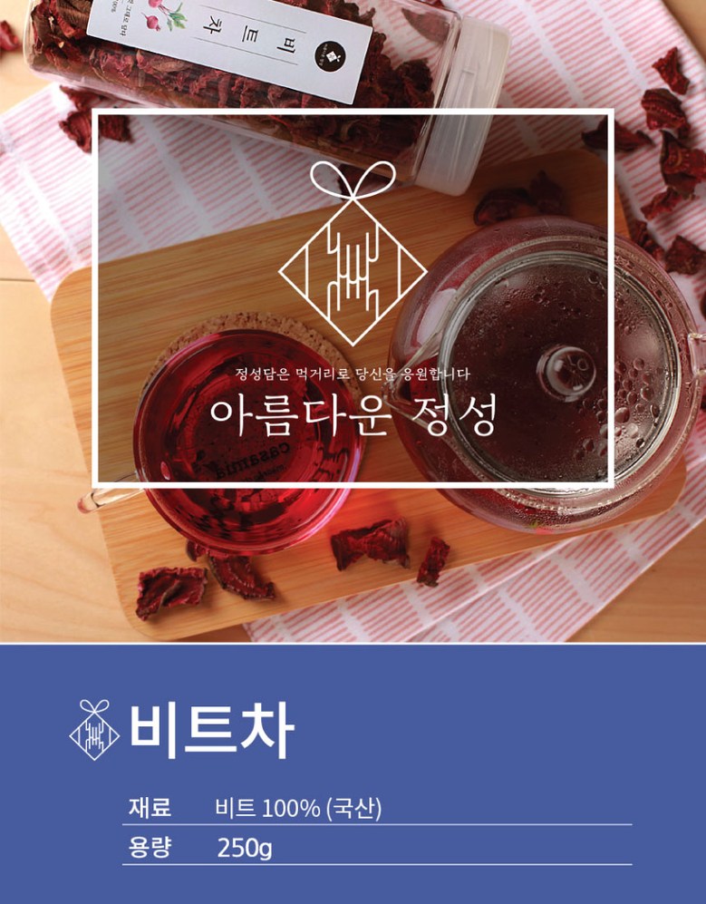 | 포장단위별 내용물의 용량(중량), 수량 | 국내산 비트차 250g + 기프트박스 | 원재료명 및 함량 | 100% 국산 비트 |