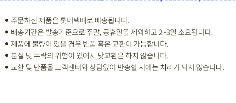 - ㆍ모니터 해상도의 차이로 인해 색상이나 이미지가 실제와 달라, 고객이 단순 변심으로 교환/반품을 무료로 요청하는 경우