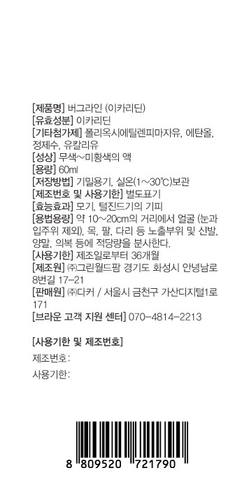 | 품명 및 모델명 | 버그라인(이카리딘) | 인증/허가 사항 | 의약외품 |