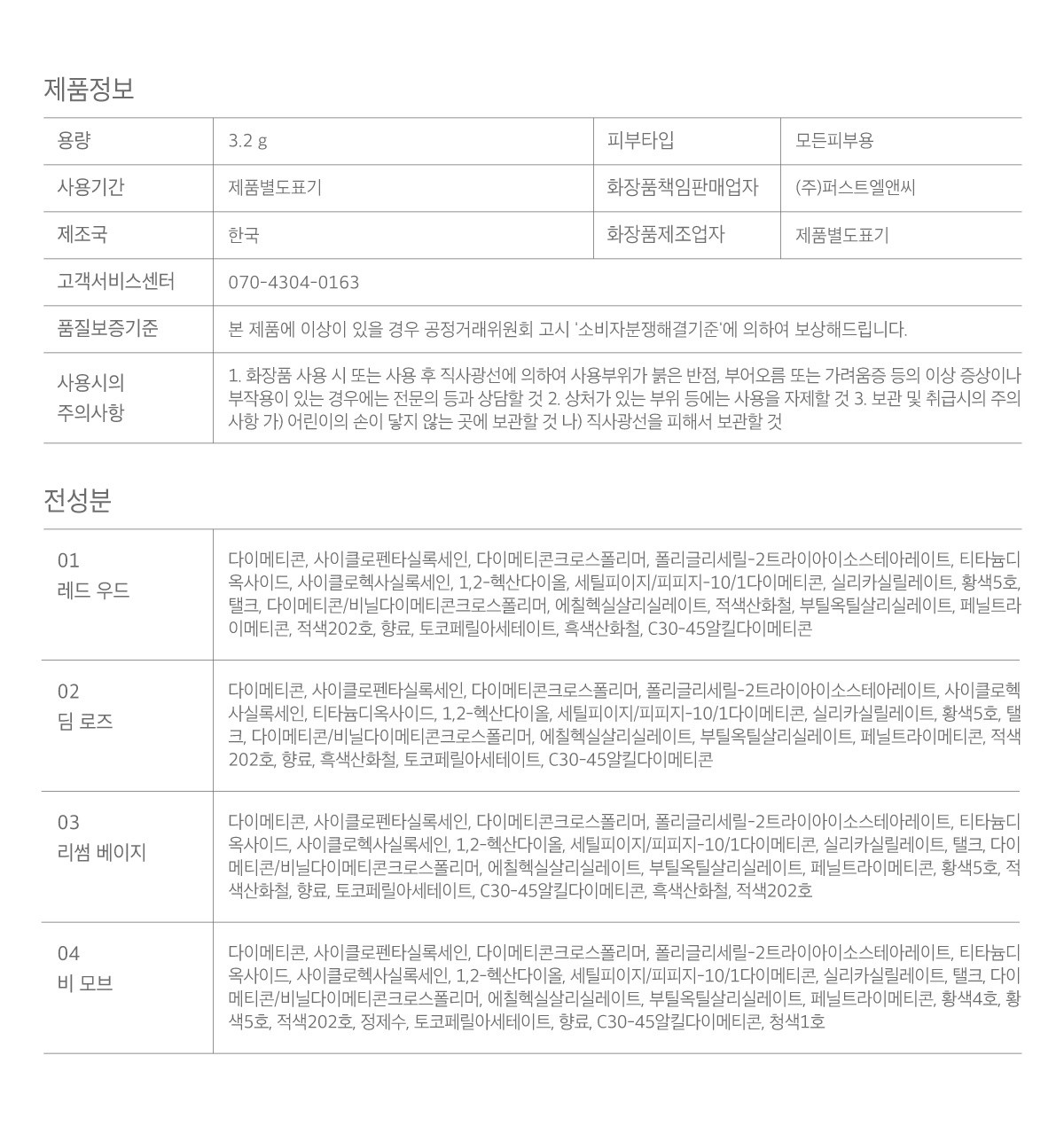 | 화장품제조업자, 화장품책임판매업자 및 맞춤형화장품판매업자 | (주)씨앤씨인터내셔널 / (주)퍼스트엘앤씨 | 제조국 | 한국 |