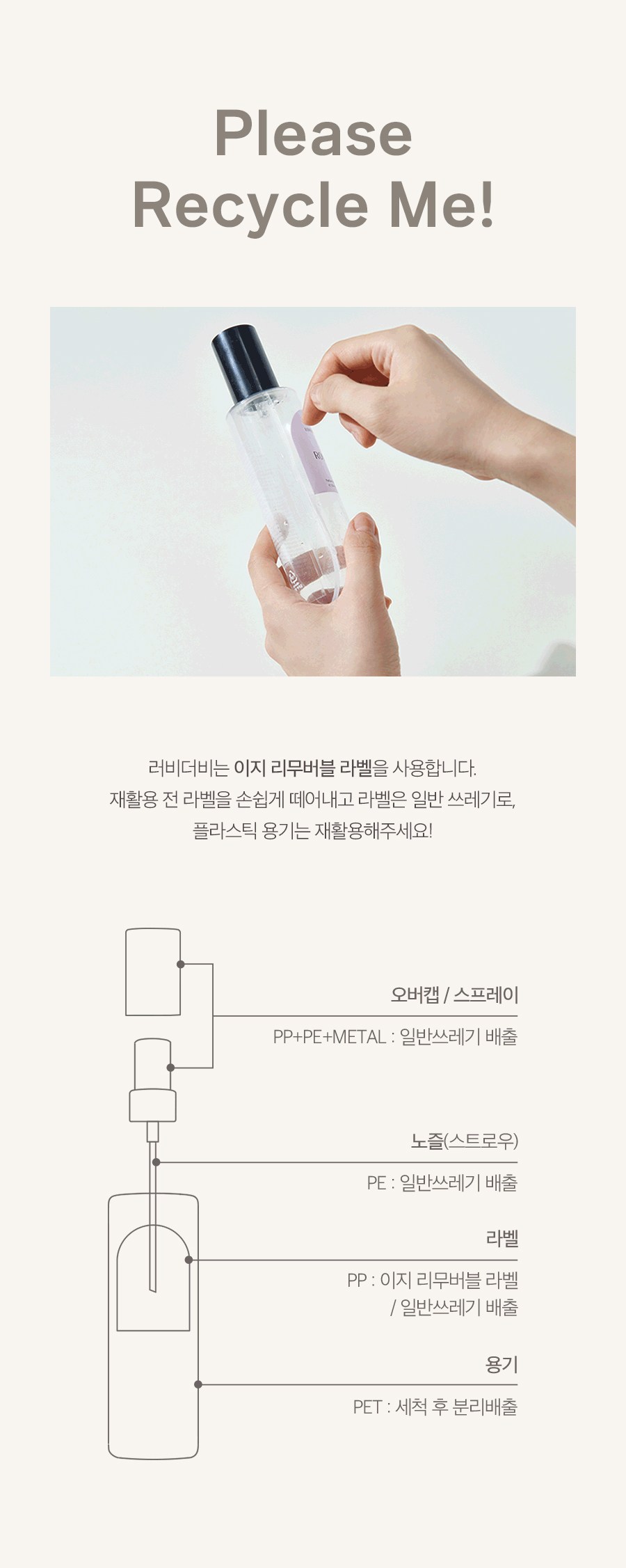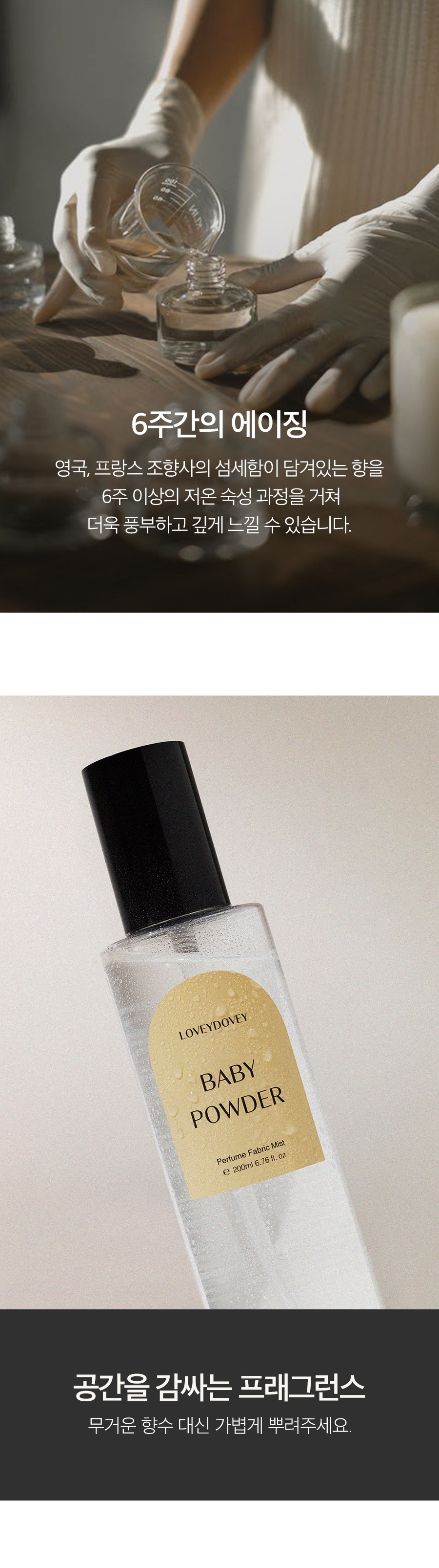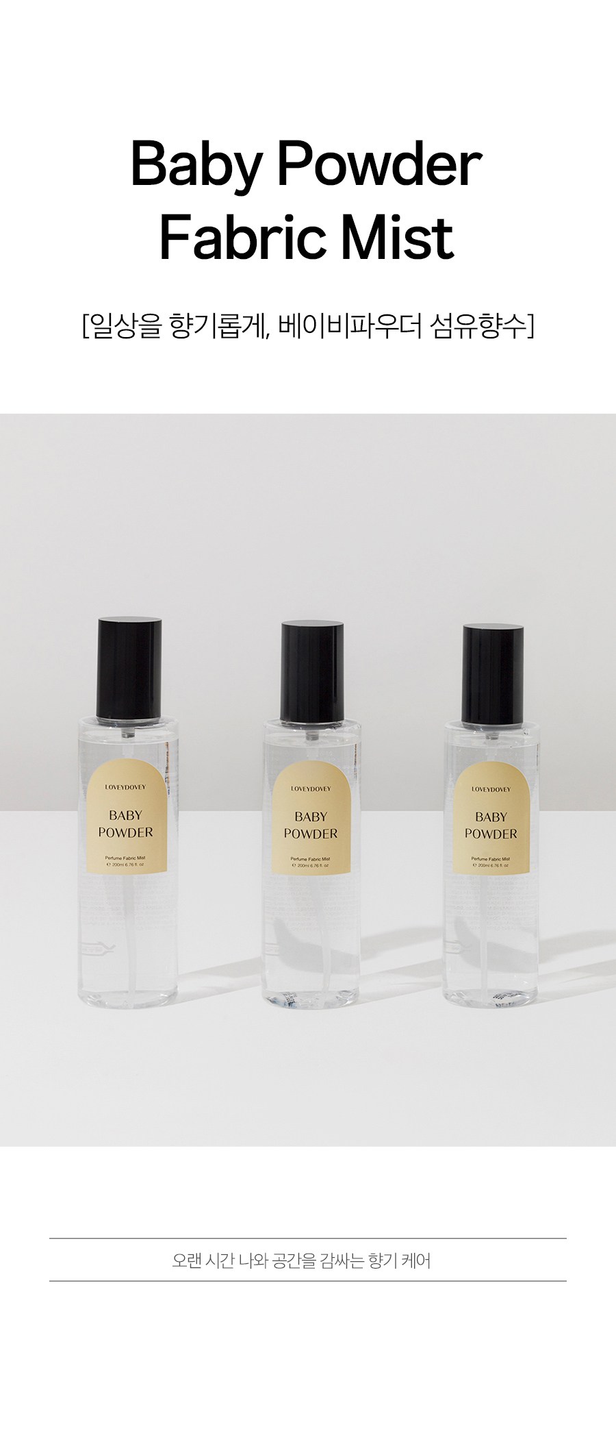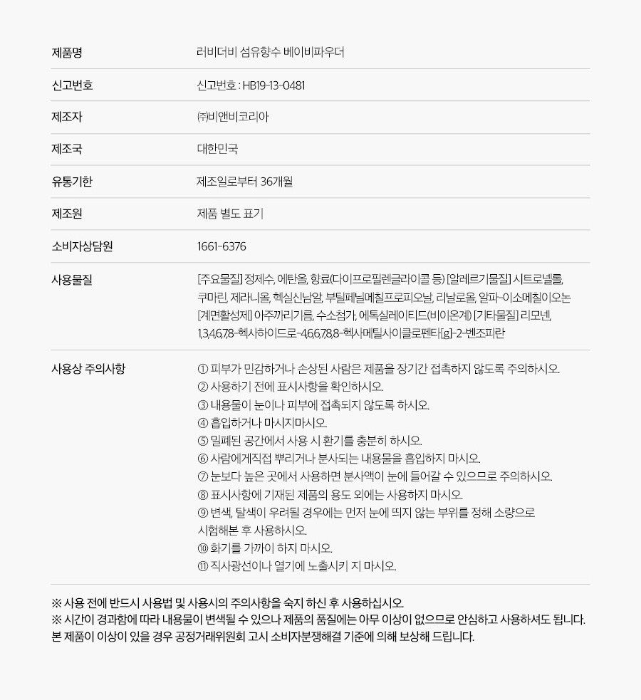 | 품목 및 제품명 | 탈취제 / 러비더비섬유향수 베이비파우더 | 용도(표백제의 경우 계열을 함께표시) 및 제형 | 일반용(물체용) / 분무기형 |