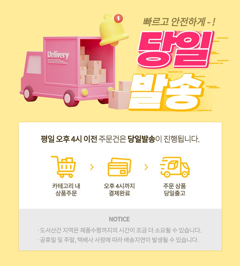 | 배송기간 | ㆍ도서산간 지역 등은 배송에 3-5일이 더 소요될 수 있습니다. - 천재지변, 물량 수급 변동 등 예외적인 사유 발생 시, 다소 지연될 수 있는 점 양해 부탁드립니다. | ||