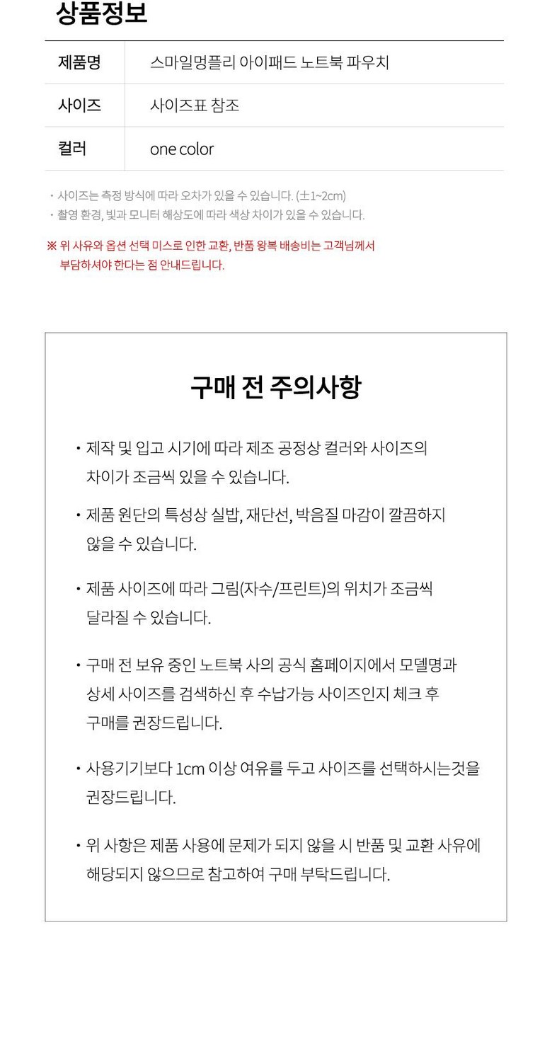 | 품명 및 모델명 | 스마일 멍플리 아이패드 파우치 | KC 인증정보 | 해당없음 |