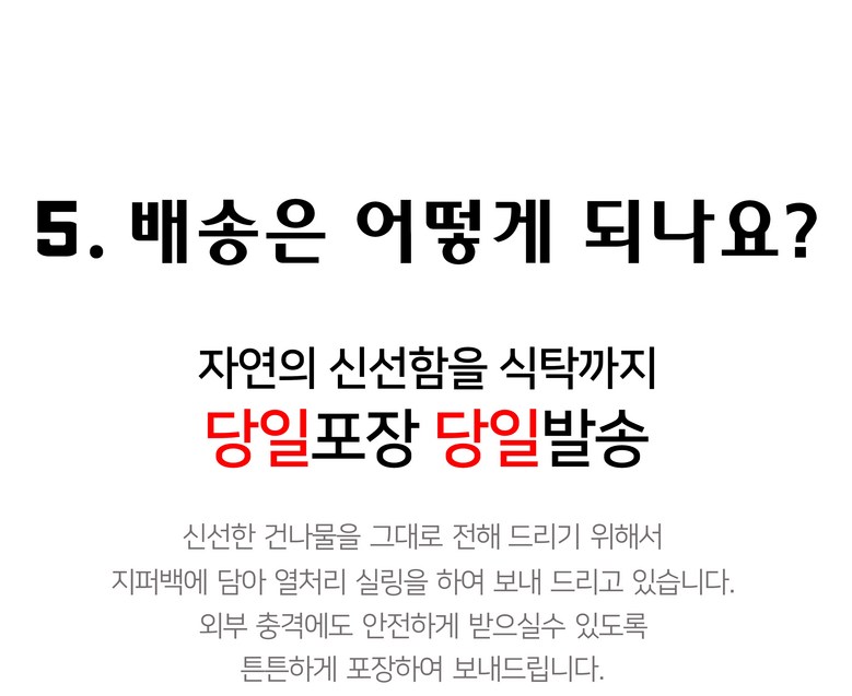 | 배송기간 | ㆍ도서산간 지역 등은 배송에 3-5일이 더 소요될 수 있습니다. - 천재지변, 물량 수급 변동 등 예외적인 사유 발생 시, 다소 지연될 수 있는 점 양해 부탁드립니다. | ||
