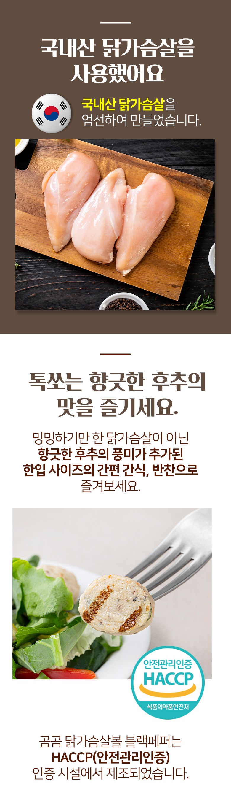 | 제품명 | 곰곰 닭가슴살볼 블랙페퍼 | 식품의 유형 | 컨텐츠 참조 |
