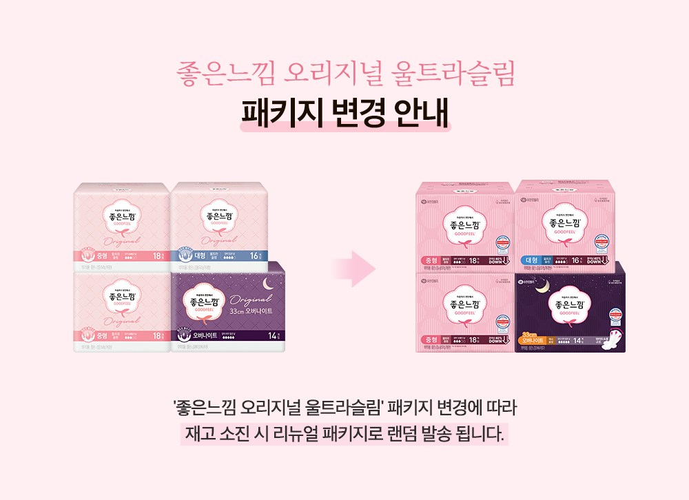 | 품명 및 모델명 | 좋은느낌 울트라 날개 중형 + 좋은느낌 울트라 날개 대형 + 좋은느낌 에이 오버나이트 | 인증/허가 사항 | 의약외품 |