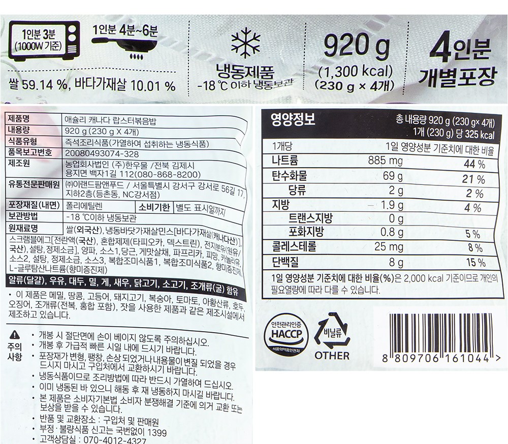 고소한 감칠맛이 입안에 감도는 볶음밥이에요. 찰지고 고슬고슬한 식감이 살아있지요. 1인분씩 개별 포장되어 있어 활용하기 편하답니다. 프라이팬이나 전자레인지로 손쉽게 조리하여 먹음직스러운 볶음밥을 식탁 위에 올려보세요.