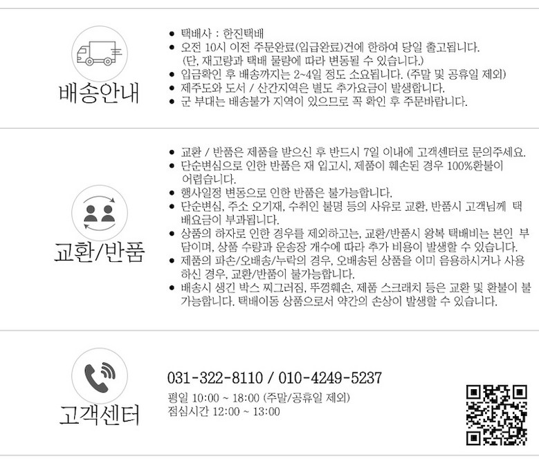 - ㆍ모니터 해상도의 차이로 인해 색상이나 이미지가 실제와 달라, 고객이 단순 변심으로 교환/반품을 무료로 요청하는 경우