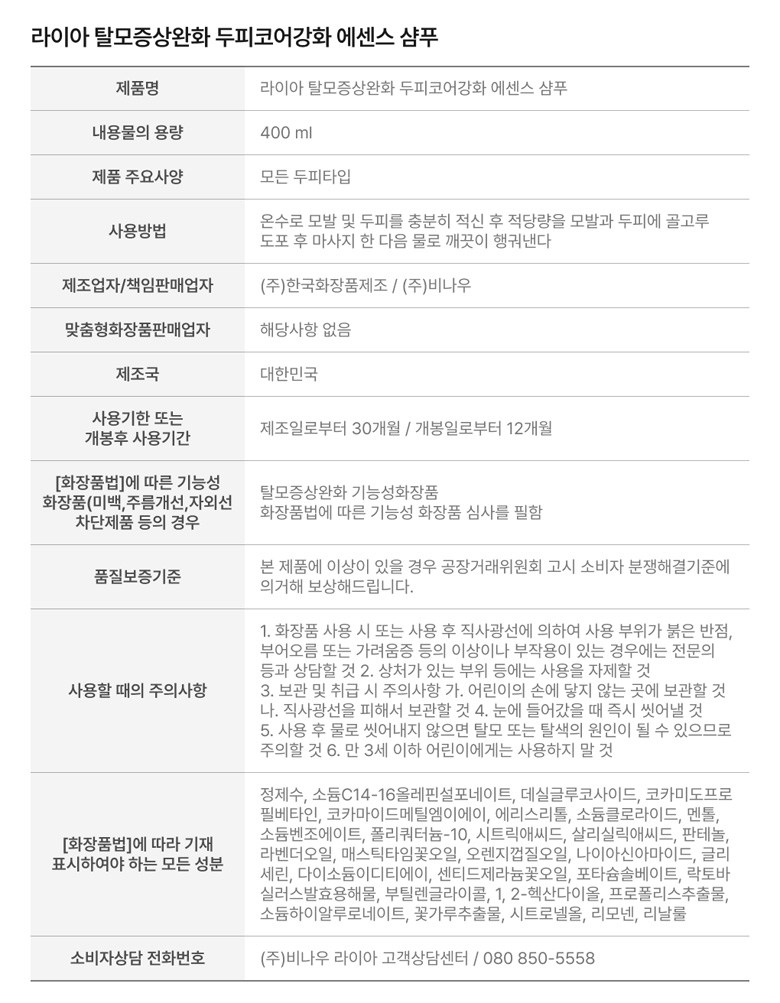 | 용량(중량) | 400ml | 제품 주요 사양 | 모든 두피타입 |