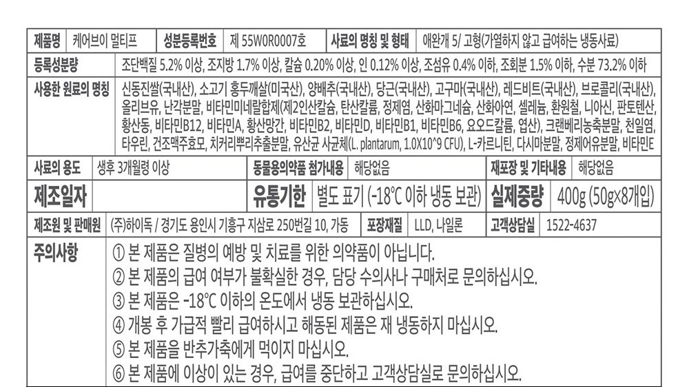 | 품명 및 모델명 | 케어브이 멀티프 | 인증/허가 사항 | 사료관리법에 따른 성분등록번호 : 컨텐츠 참조 |