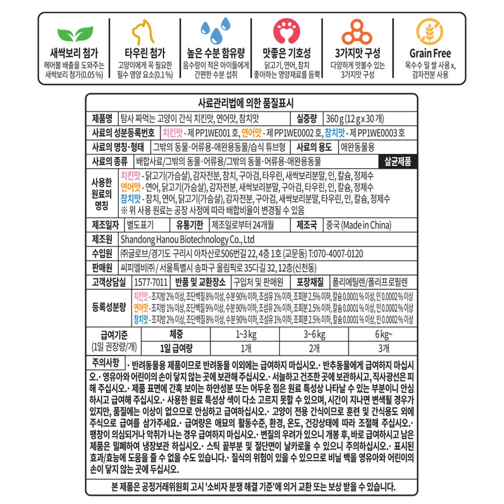 | 품명 및 모델명 | 탐사 헤어볼 방지, 짜먹는 고양이 간식 3가지맛, 30p(참치*10p+연어*10p+치킨*10p) | 인증사항 | 해당사항 없음 |