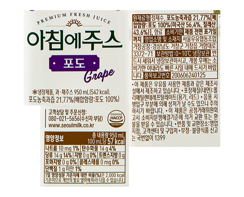| 제품명 | 아침에주스 포도주스 | 식품의 유형 | 주스 |