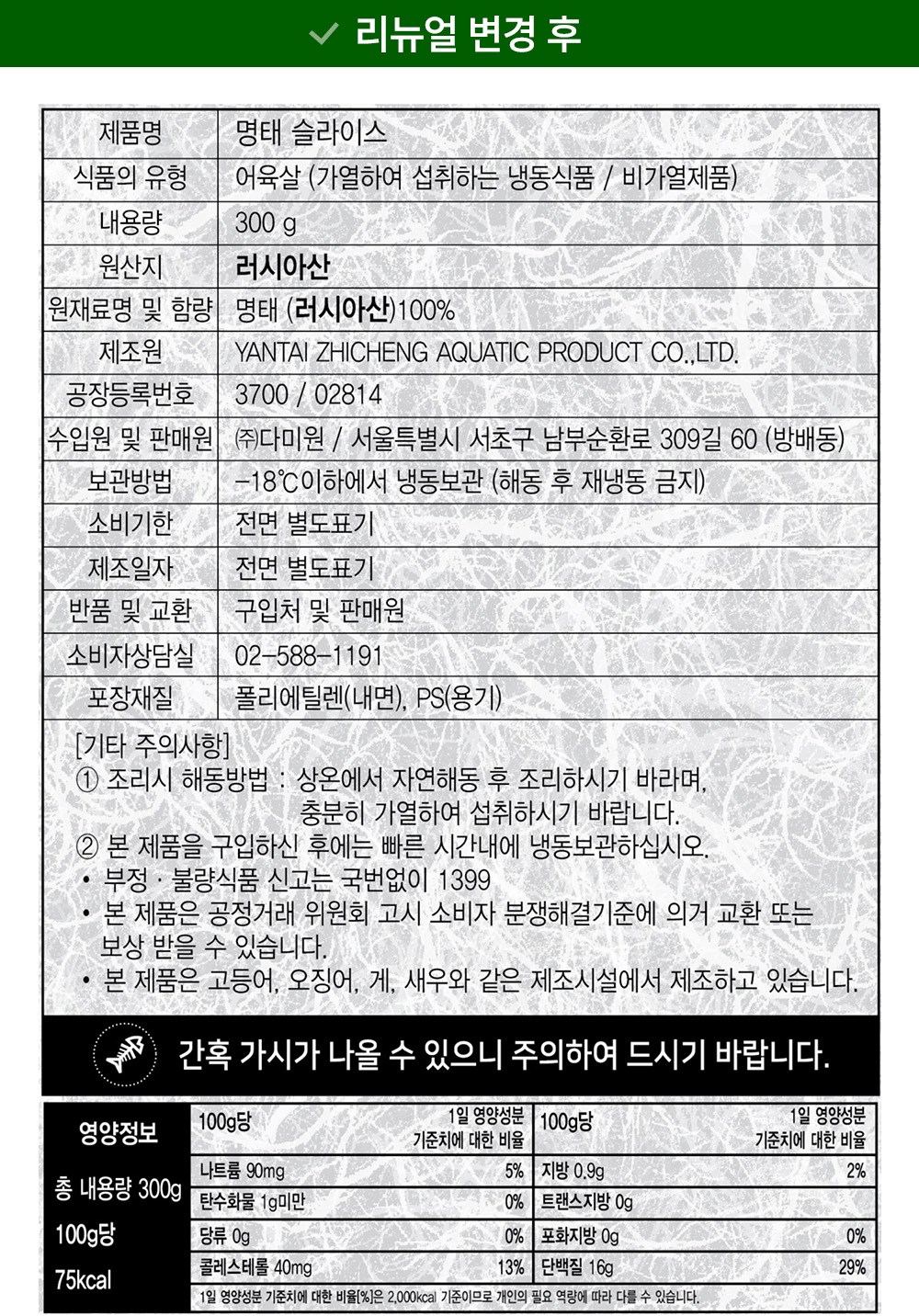 담백한 풍미와 부드러운 식감으로 입맛을 사로잡는 명태. 손쉽게 요리할 수 있도록 먹기 좋게 슬라이스 했어요. 노릇노릇한 전으로 즐겨도 좋고, 구이, 찌개 등으로 활용해도 맛있답니다.