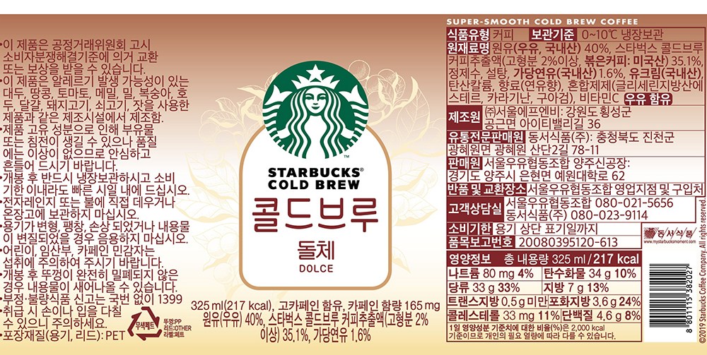 | 제품명 | STARBUCKS COLD BREW 콜드브루 돌체 | 식품의 유형 | 컨텐츠 참조 |