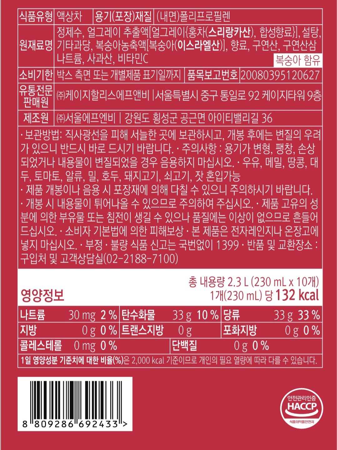 | 제품명 | 할리스 복숭아 얼그레이 | 식품의 유형 | 컨텐츠 참조 |