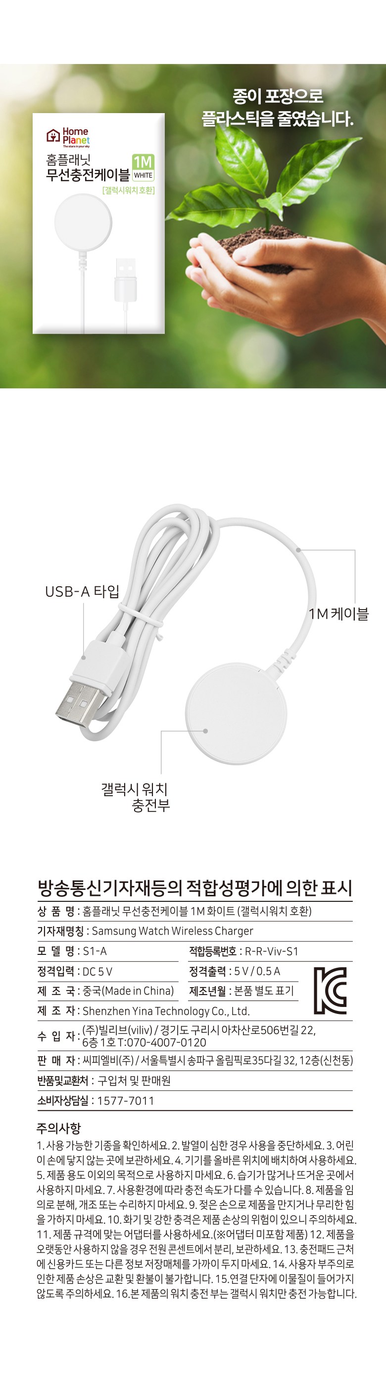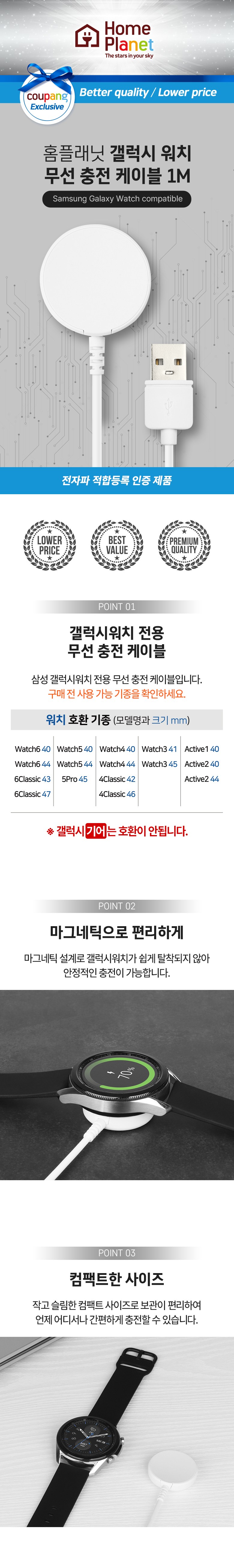 | 품명 및 모델명 | 홈플래닛 무선충전기 1m (삼성 갤럭시워치 3 4 4 클래식 액티브 1 2 호환) 화이트 | KC 인증정보 | R-R-Viv-S1 |