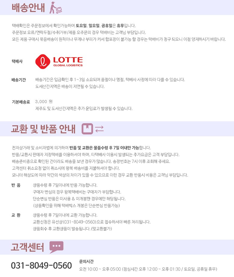 - ㆍ모니터 해상도의 차이로 인해 색상이나 이미지가 실제와 달라, 고객이 단순 변심으로 교환/반품을 무료로 요청하는 경우