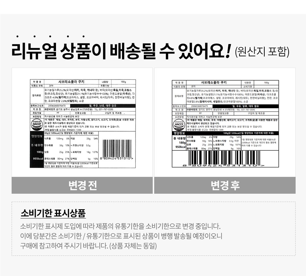| 생산자 및 소재지 | 컨텐츠 참조 | 제조연월일, 소비기한 또는 품질유지기한 | 소비기한(또는 유통기한) : 2026년 05월 15일 이거나 그 이후인 상품 제조년월일 : 2026년 04월 13일 이후인 제조상품 |