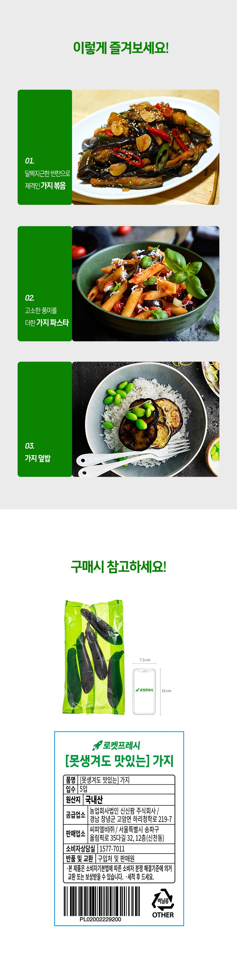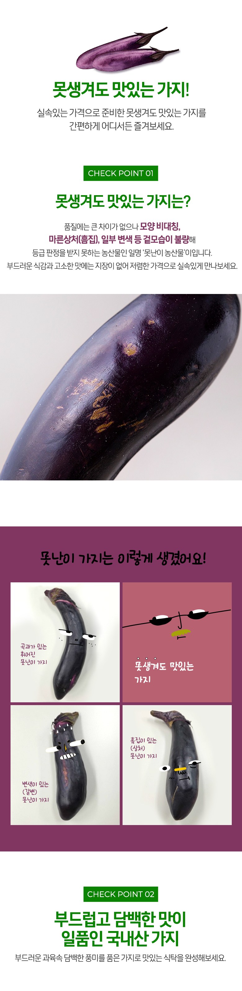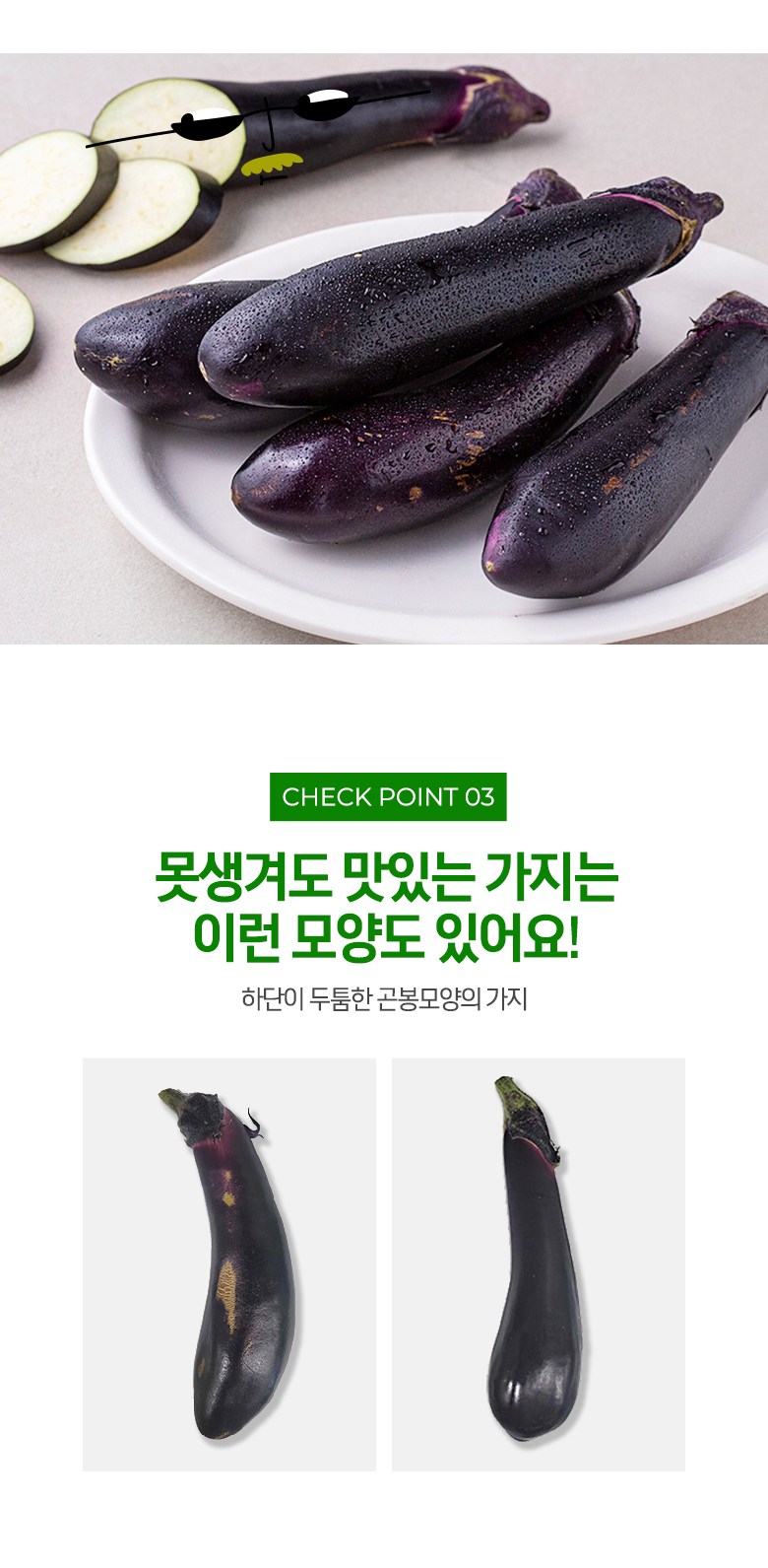 | 품목 또는 명칭 | [못생겨도 맛있는] 가지 | 포장단위별 내용물의 용량(중량),수량,크기 | 5개입(500g)x2개 |