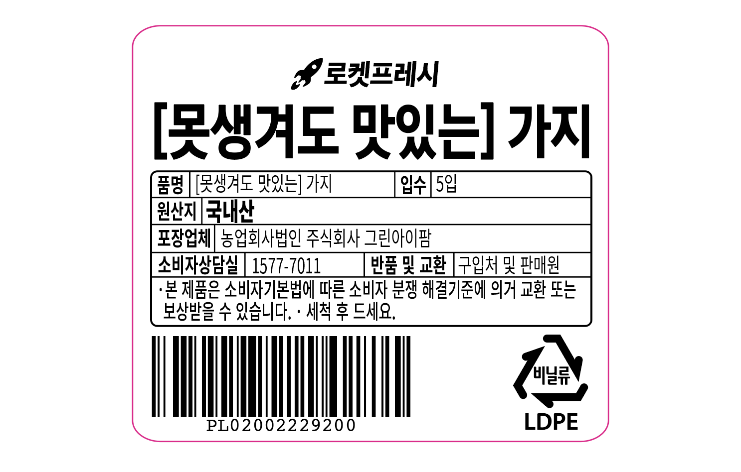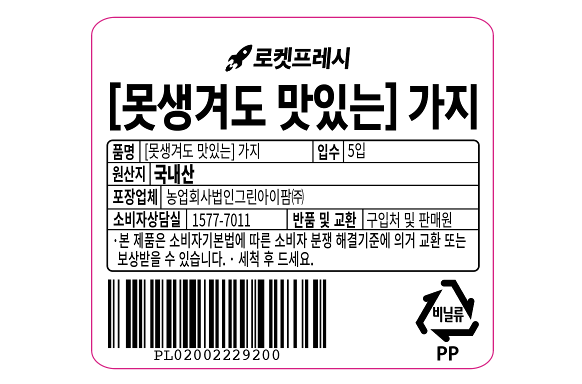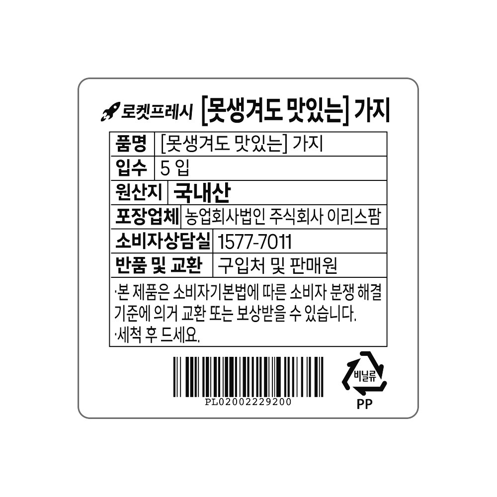 | 품목 또는 명칭 | [못생겨도 맛있는] 가지 | 포장단위별 내용물의 용량(중량),수량,크기 | 5개입(500g)x2개 |