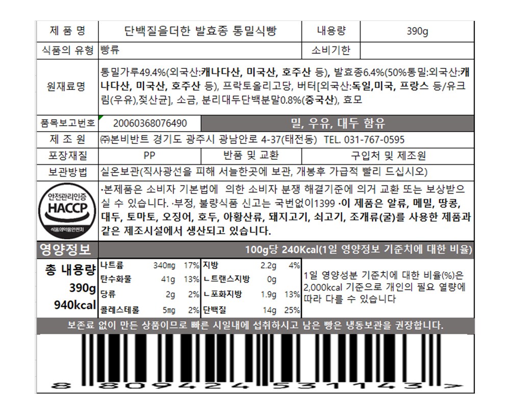 | 제품명 | 단백질을더한 발효종 통밀식빵 | 식품의 유형 | 컨텐츠 참조 |