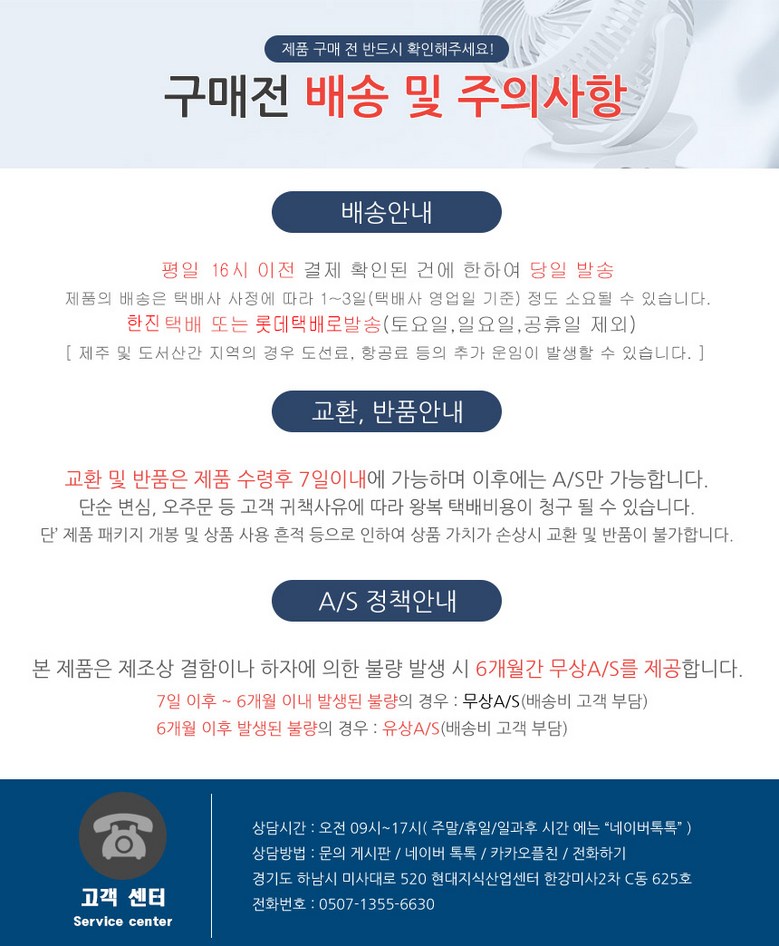 - ㆍ모니터 해상도의 차이로 인해 색상이나 이미지가 실제와 달라, 고객이 단순 변심으로 교환/반품을 무료로 요청하는 경우