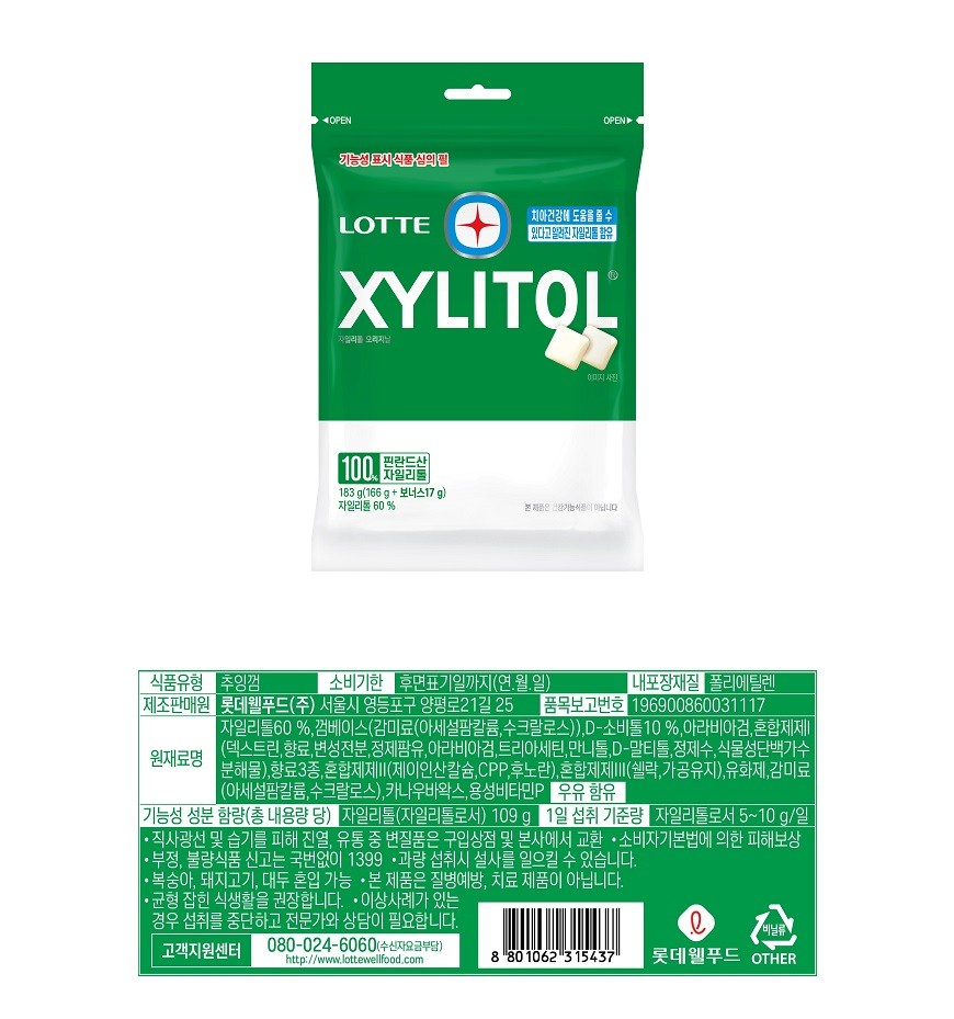 | 제품명 | LOTTE 자일리톨 오리지날 | 식품의 유형 | 컨텐츠 참조 |