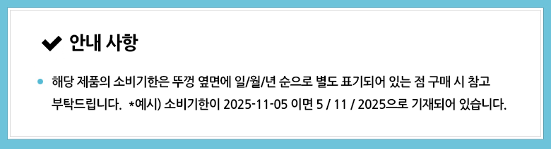 | 생산자 및 소재지 | 컨텐츠참조 | 제조연월일, 소비기한 또는 품질유지기한 | 소비기한(또는 유통기한) : 2026년 04월 26일 이거나 그 이후인 상품 제조년월일 : 1945년 08월 15일 이후인 제조상품 |