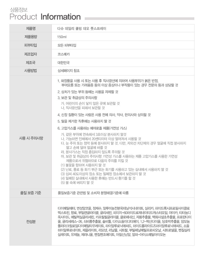 | 화장품제조업자, 화장품책임판매업자 및 맞춤형화장품판매업자 | (주)코스메카코리아 / 다슈코리아 | 제조국 | 대한민국 |