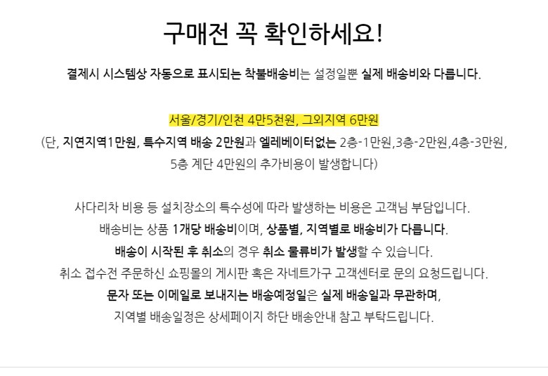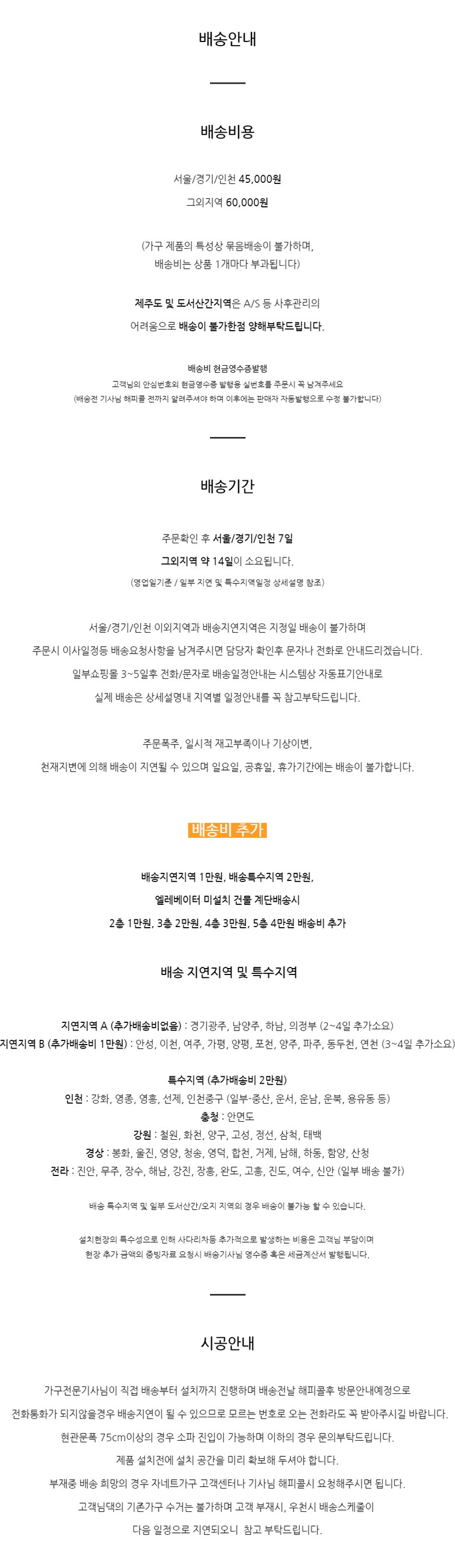 | 배송방법 | 업체직송 | 배송비 | 착불배송(상품별 배송비, 배송가능지역은 상세페이지 참조) - 도서산간 지역 배송불가 |