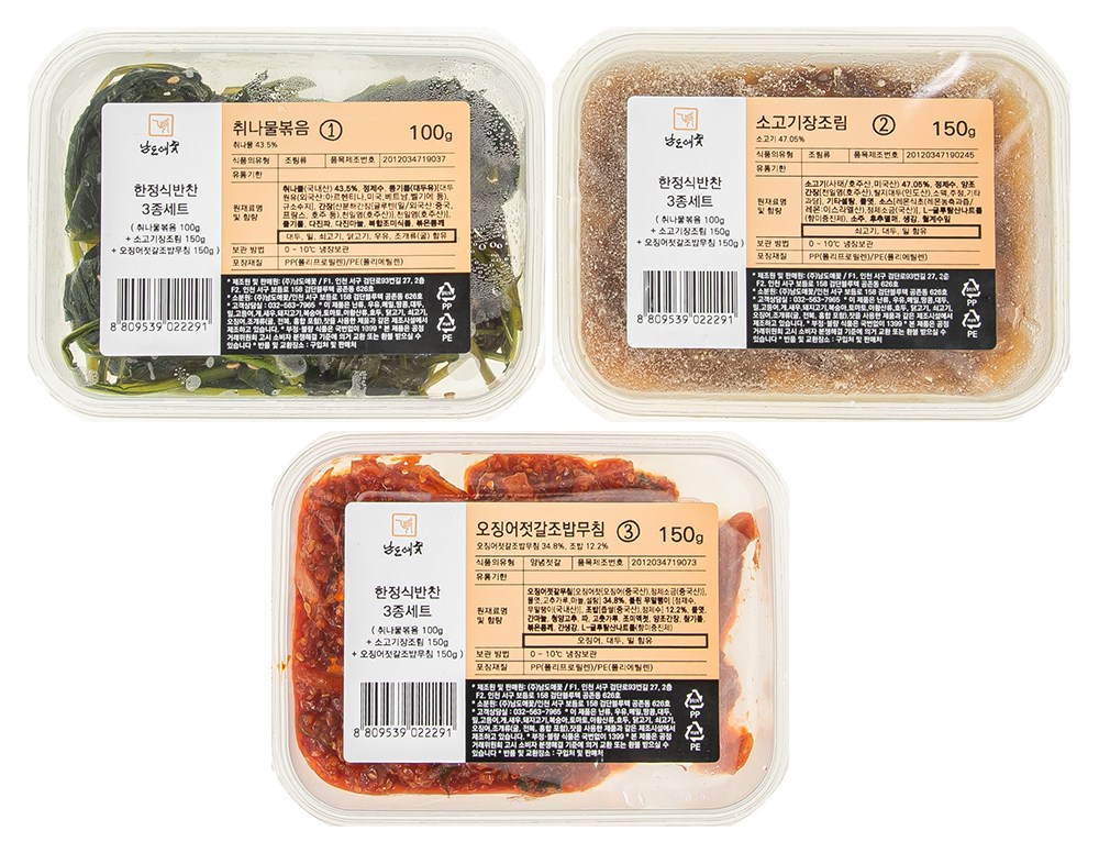 | 포장단위별 내용물의 용량(중량), 수량 | 취나물볶음 100g + 소고기장조림 150g + 오징어젓갈조밥무침 150g, 1개 | 원재료명 및 함량 | 컨텐츠 참조 |