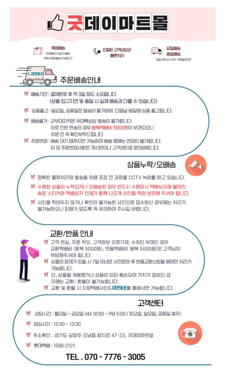- ㆍ모니터 해상도의 차이로 인해 색상이나 이미지가 실제와 달라, 고객이 단순 변심으로 교환/반품을 무료로 요청하는 경우