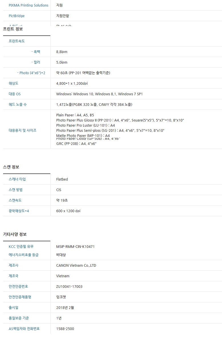 | 출시년월 | 2018년 2월 | 제조자(수입자) | Canon Inc / 캐논코리아 |