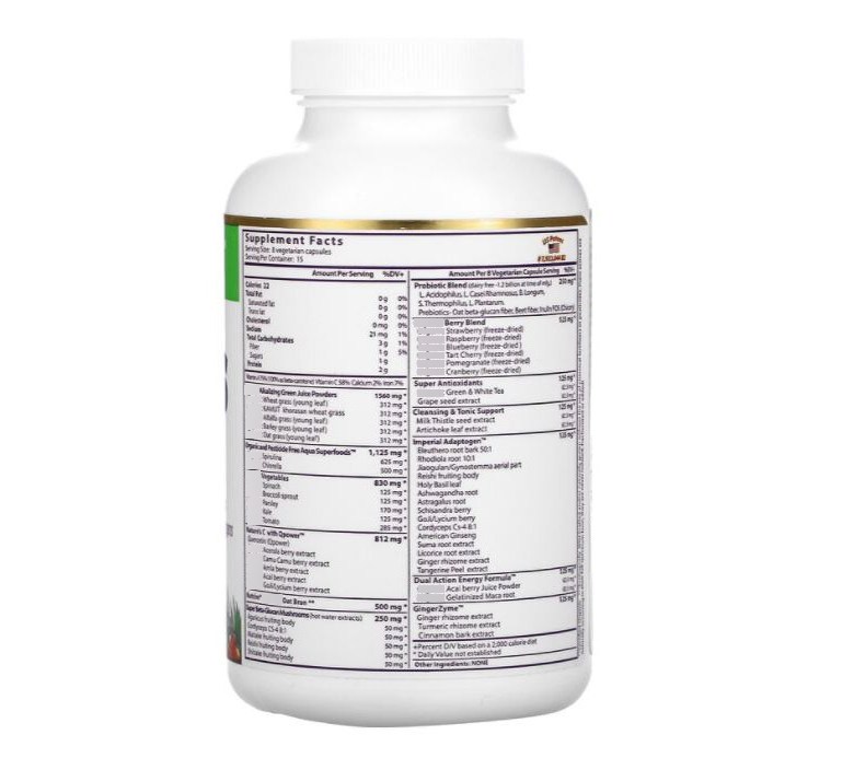 다양한 과일과 열매, 채소, 버섯 등 식품 영양소를 블렌딩하여 만들 식이 보충제입니다. 프로바이오틱스 및 허브 농축물을 함유하고 있습니다. 섭취 및 흡수가 용이한 베지 캡슐 형태로 제공됩니다.