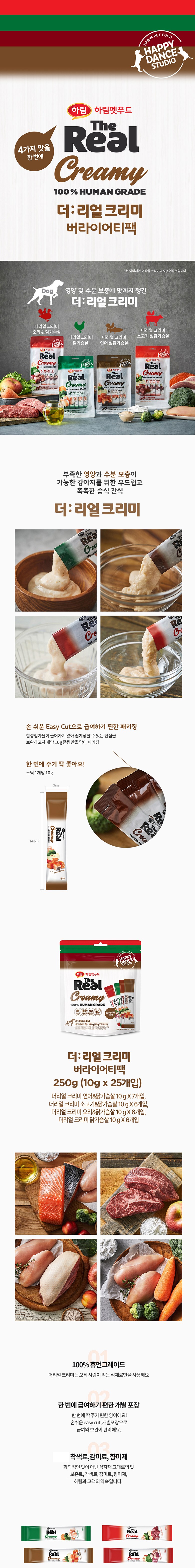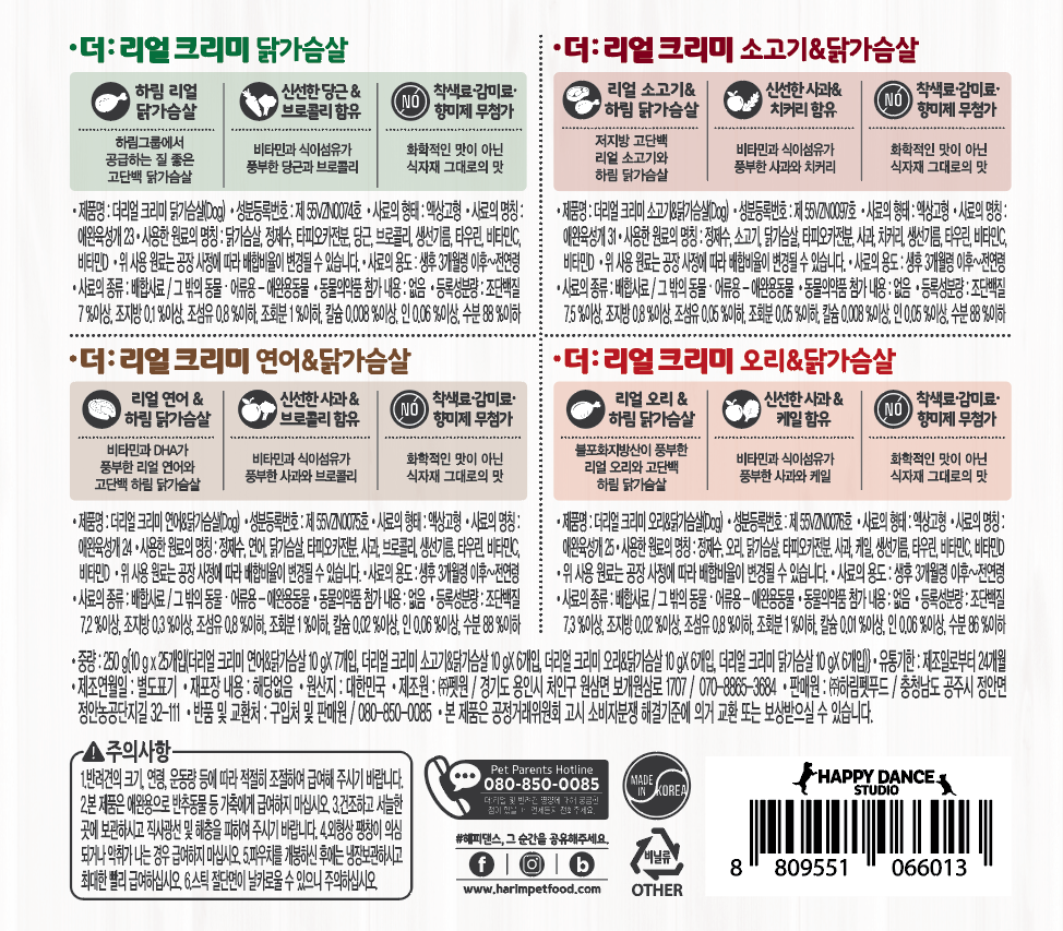 | 품명 및 모델명 | 더리얼 크리미 버라이어티 팩(Dog) | 인증사항 | 사료관리법에 따른 성분등록번호 : 컨텐츠 참조 |
