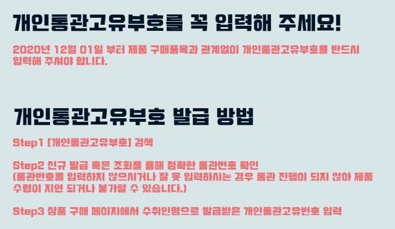 - 법규 개정에 따라 개인통관고유부호 검증 절차가 강화되었습니다. 결제 단계에서 받는 사람의 정보가 관세청 등록 정보 (성명, 휴대폰, 개인통관고유부호, 주소) 와 일치하는지 확인해주세요.