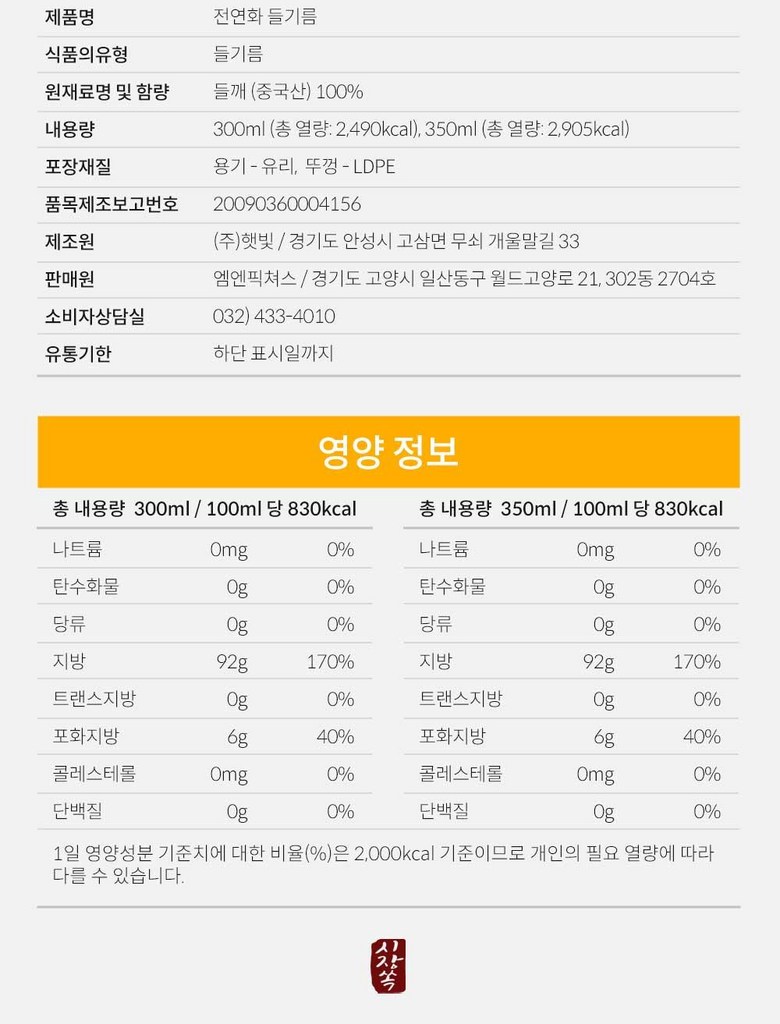 | 포장단위별 내용물의 용량(중량), 수량 | 350ml, 3병 | 원재료명 및 함량 | 원재료명: 통들깨(중국산) 함량: 100% |