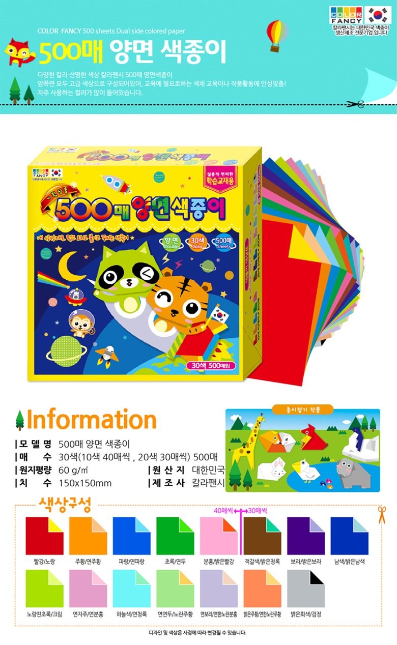 | 품명 및 모델명 | 칼라팬시 500매 양면 색종이, 30색 | 인증/허가 사항 | B441M009-8001A |