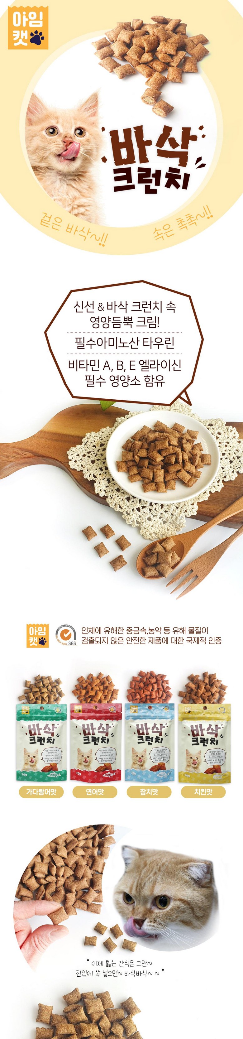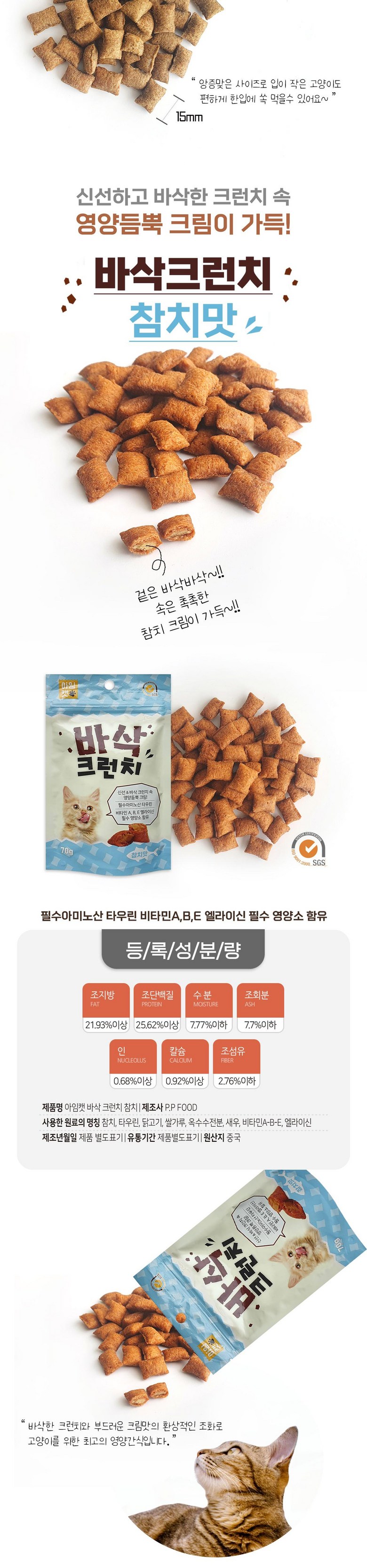 | 품명 및 모델명 | 아임캣 바삭크런치 | 인증/허가 사항 | 사료성분등록번호 : 제6678G0015호 외 |