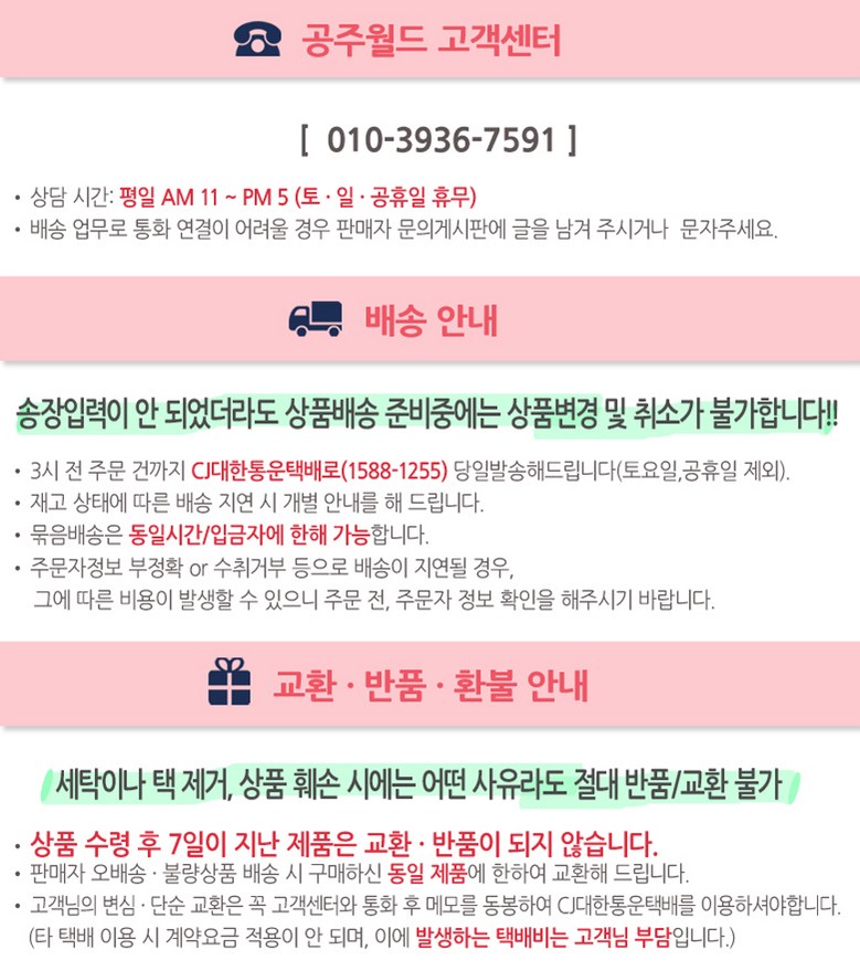 - ㆍ교환/반품에 관한 일반적인 사항은 판매자가 제시사항보다 관계법령이 우선합니다.