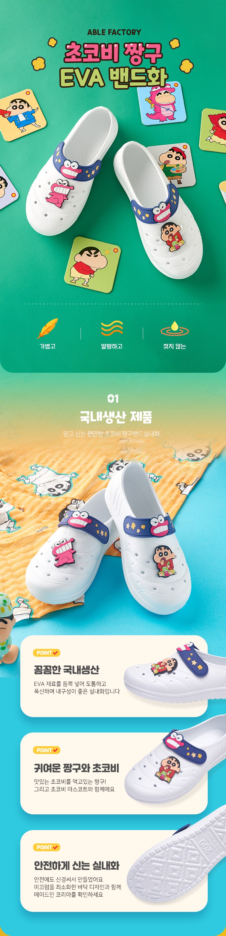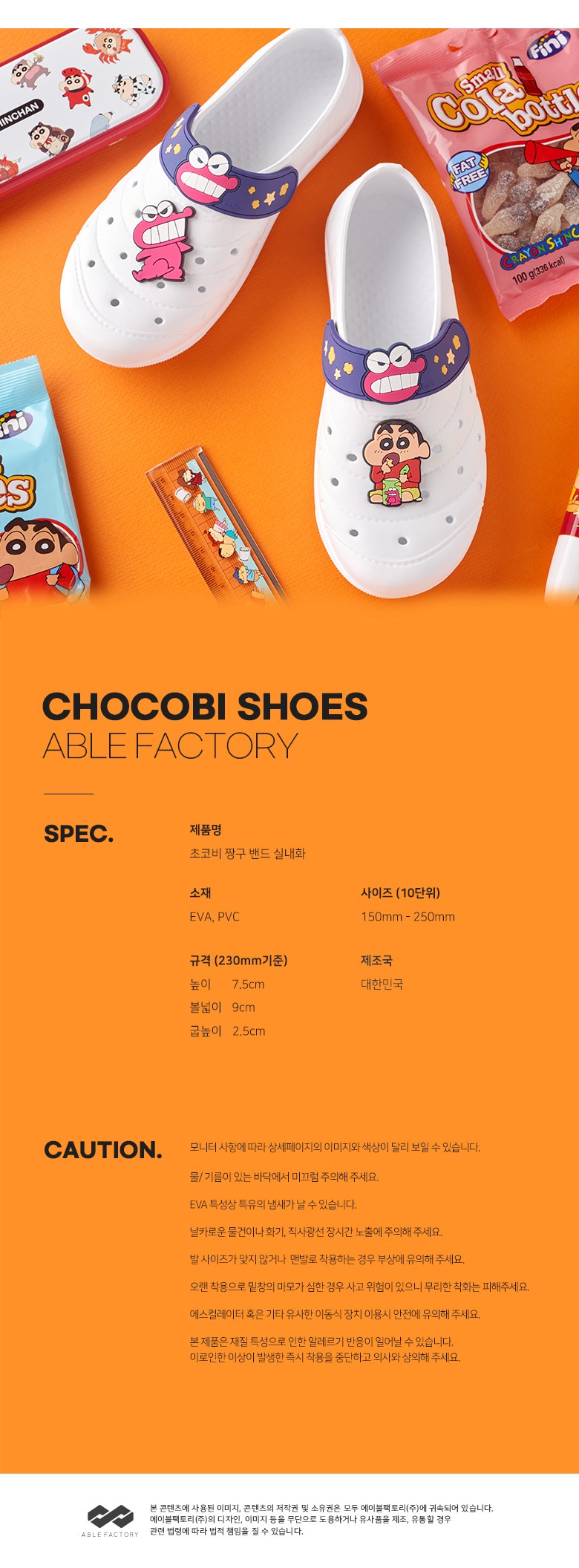 | 품명 및 모델명 | 에이블팩토리 아동용 초코비 짱구 EVA 밴드 실내화 | KC 인증정보 | 유/KC마크 |