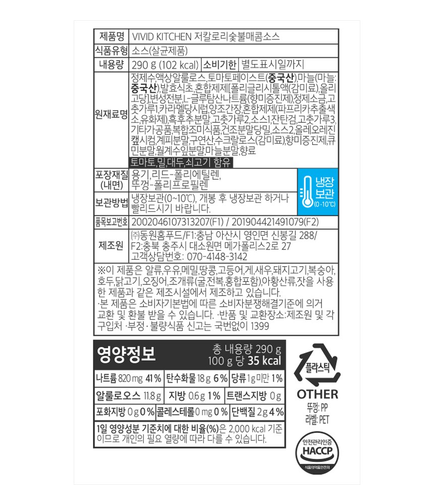 숯불매콤소스도 비비드키친이 선보이면 특별하죠. 깔끔하게 즐기는 저칼로리 숯불매콤소스예요. 액상 알룰로스를 사용해 부드러운 달콤함이 특징이랍니다. 치킨이나 불고기를 요리할 때 활용해보세요. 그윽한 향미와 매콤한 감칠맛을 손쉽게 즐길 수 있을 거예요.