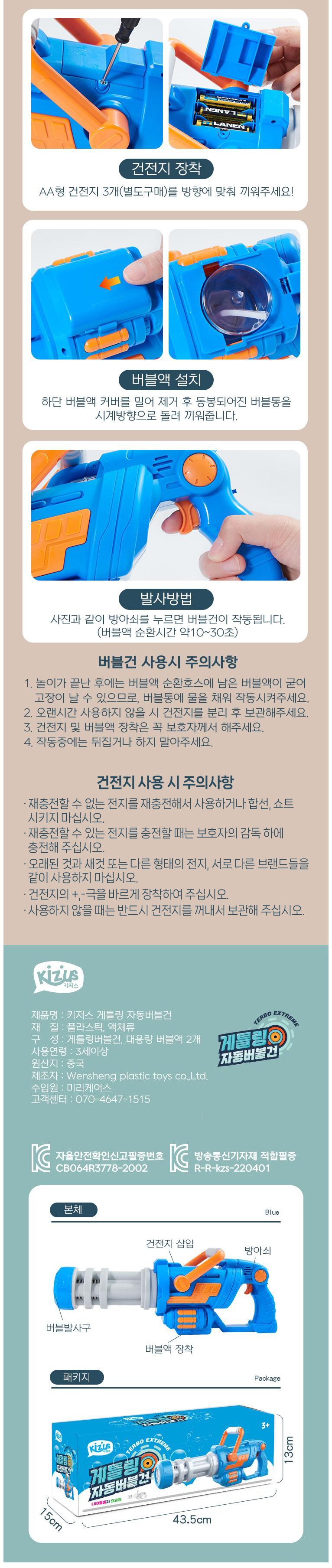 | 품명 및 모델명 | 키저스 게틀링 자동버블건 / Kizus210401, kizus210301 | KC 인증정보 | CB064R3778-2002, R-R-kzs-220401 |