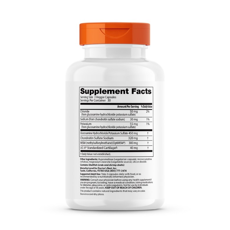 글루코사민과 콘드로이틴, MSM을 담은 식이 보충제입니다. 1회 제공량 당 글루코사민 450mg, MSM 300mg, 콘드로이틴 320mg, UC-II® 40mg이 함유되어 있습니다. 삼키기 쉬운 베지 캡슐 제형입니다.