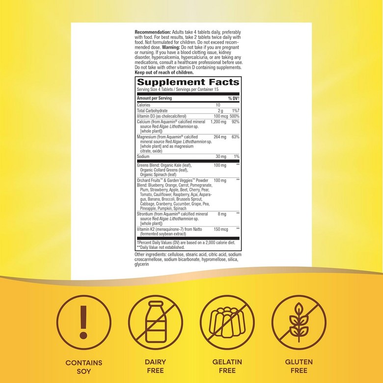 칼슘 식이 보조제입니다. 1인분 당 비타민 D3, K2, 칼슘, 마그네슘, 나트륨, 과일 블렌드 등을 제공합니다.