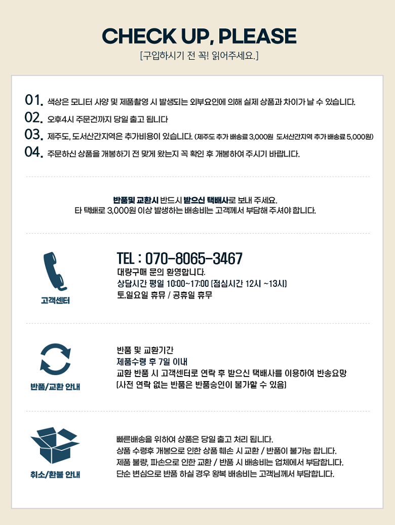 - ㆍ모니터 해상도의 차이로 인해 색상이나 이미지가 실제와 달라, 고객이 단순 변심으로 교환/반품을 무료로 요청하는 경우