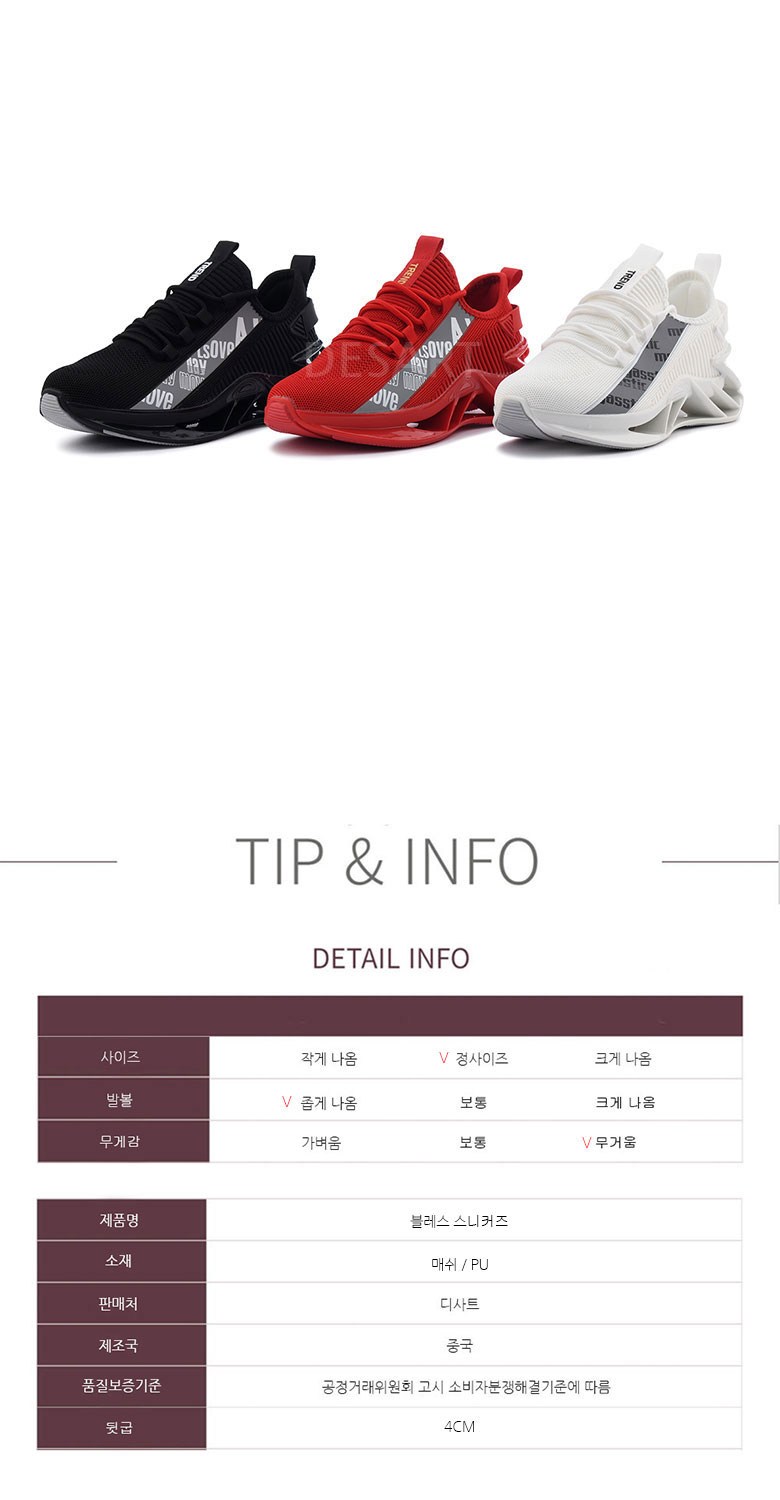 | 제품의 주소재(운동화인 경우에는 겉감,안감을 구분하여 표시) | PU,합성섬유 | 색상 | 레드,화이트,블랙 |