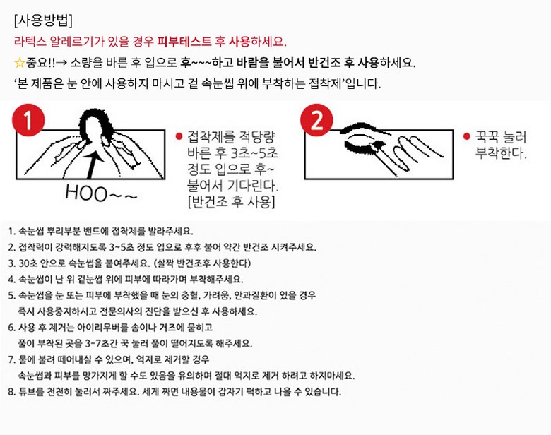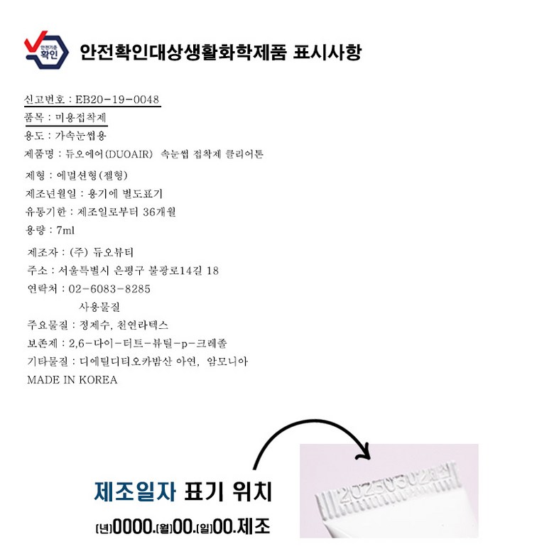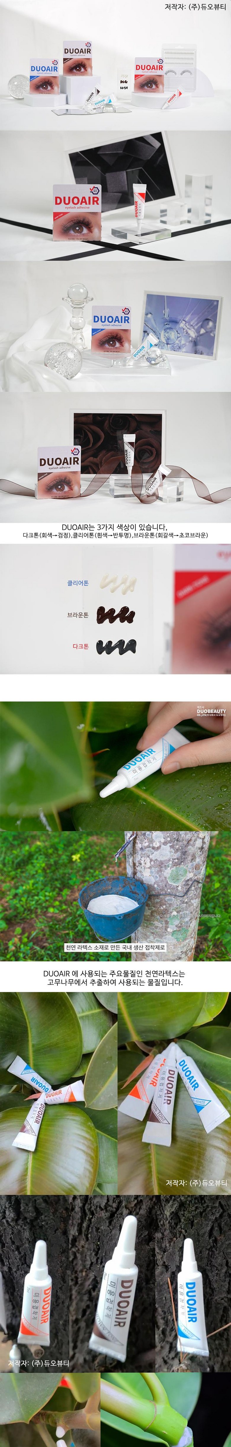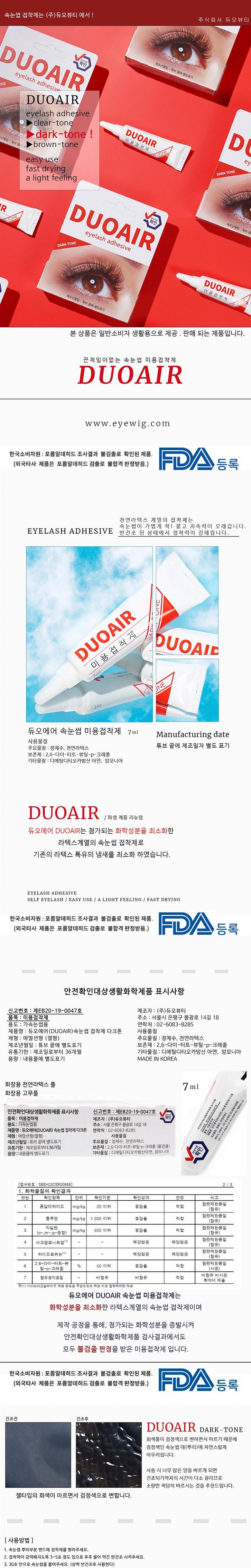 | 제조연월 및 유통기한 (유통기한의 경우 해당 없는 제품은 생략 가능) | 제조일로부터 36개월(듀오에어(DUOAIR) 속눈썹 접착제 다크톤, 듀오에어(DUOAIR) 속눈썹 접착제 클리어톤) / 제조일로부터 24개월(듀오에어(DUOAIR) 속눈썹 접착제 브라운톤) | 중량∙용량∙매수∙크기 | 7ml |