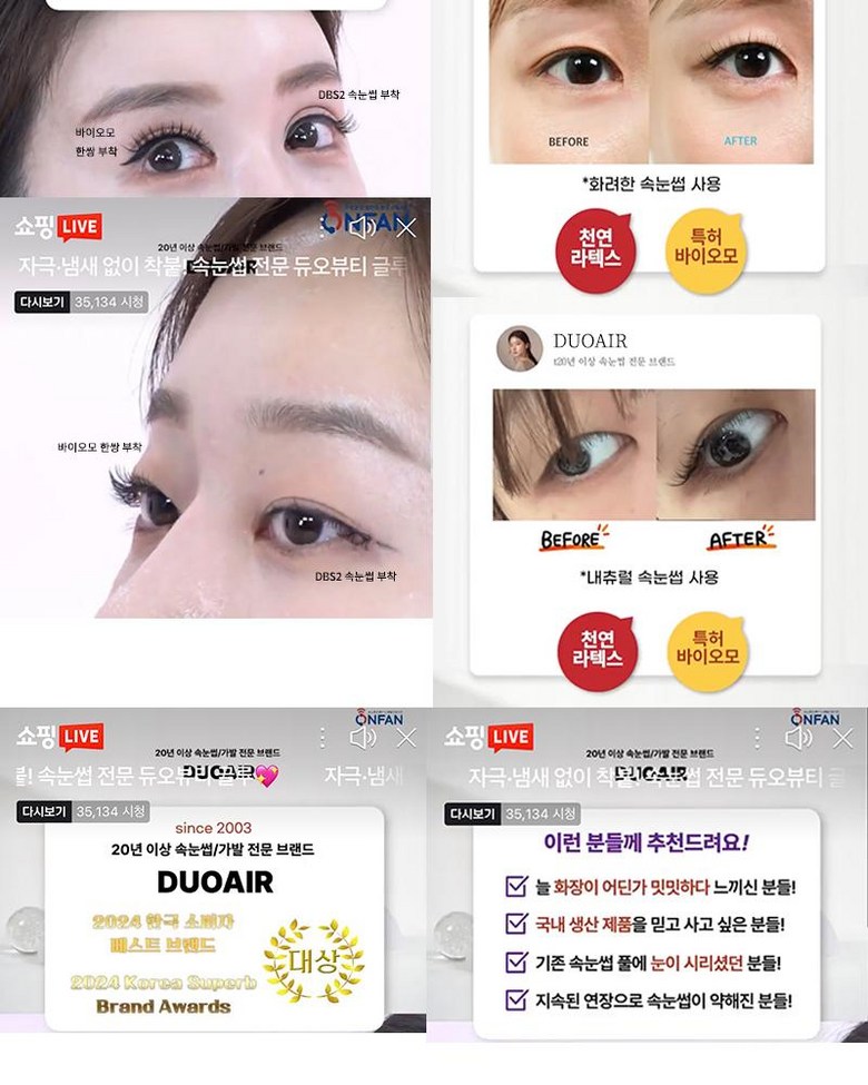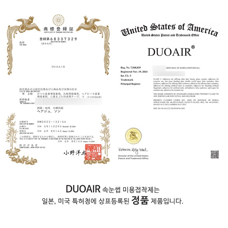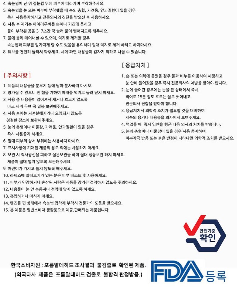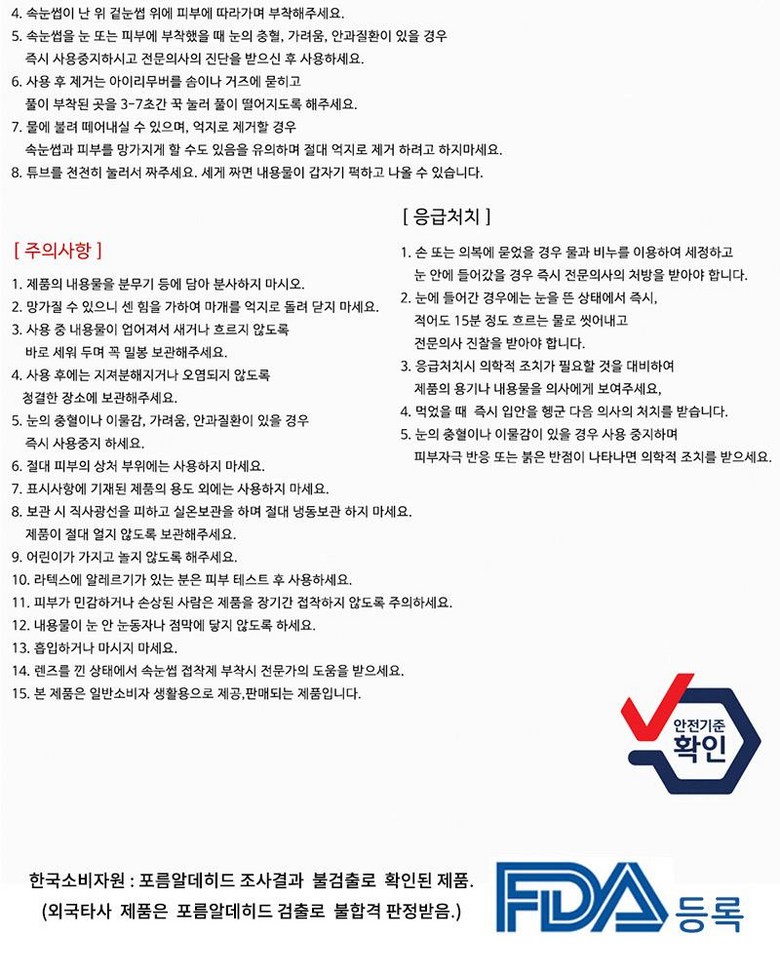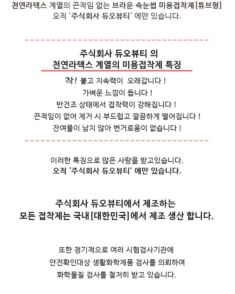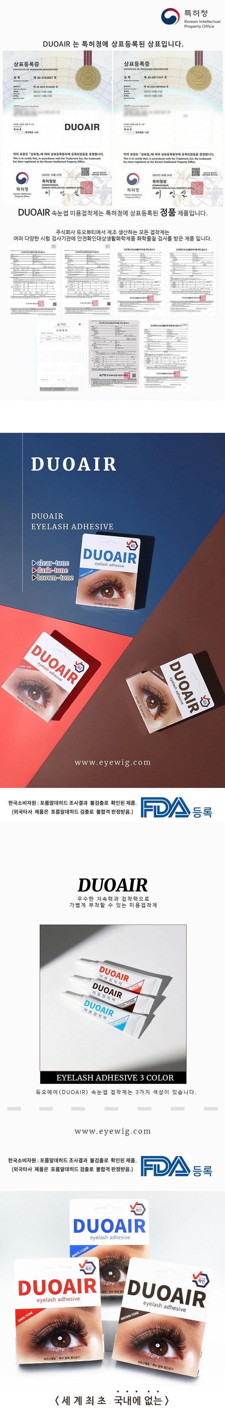 | 품목 및 제품명 | 미용접착제 / 듀오에어 (DUOAIR) 속눈썹 접착제 다크톤 , 듀오에어 (DUOAIR) 속눈썹 접착제 클리어톤 , 듀오에어 (DUOAIR) 속눈썹 접착제 브라운톤 | 용도(표백제의 경우 계열을 함께표시) 및 제형 | 가속눈썹용 / 에멀션형(젤형) |
