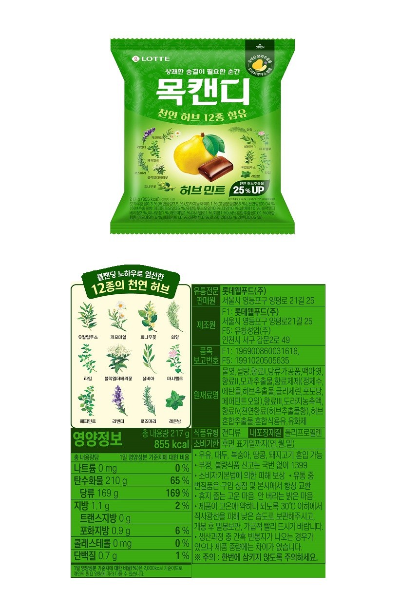 | 제품명 | 롯데제과 목캔디 허브민트 | 식품의 유형 | 캔디류 |